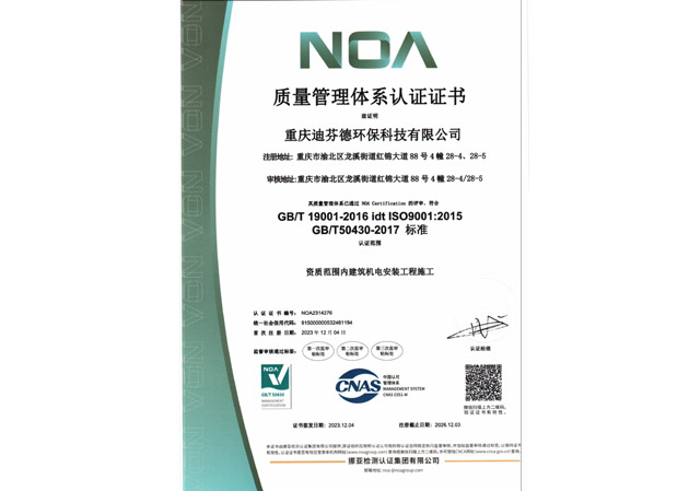 重慶迪芬德環保科技有限公司,成立於2012年9月。公司擁有建築裝修裝飾工程貳級、建築機電安裝工程貳級、消防設施工程貳級資質,並通過ISO 9001質量管理體係、ISO 14001環境管理體係、ISO 45001職業健康安全管理體係認證,是專業從事空氣淨化類的高科技企業,公司秉承“科技創造價值、超越客戶期望”的理念。