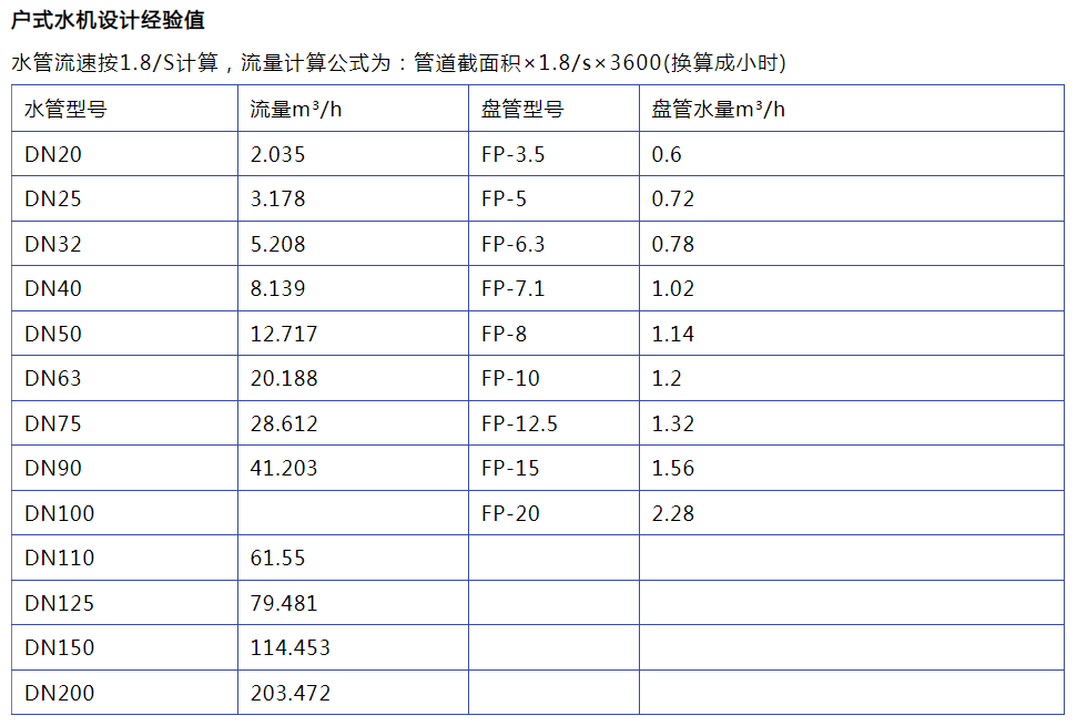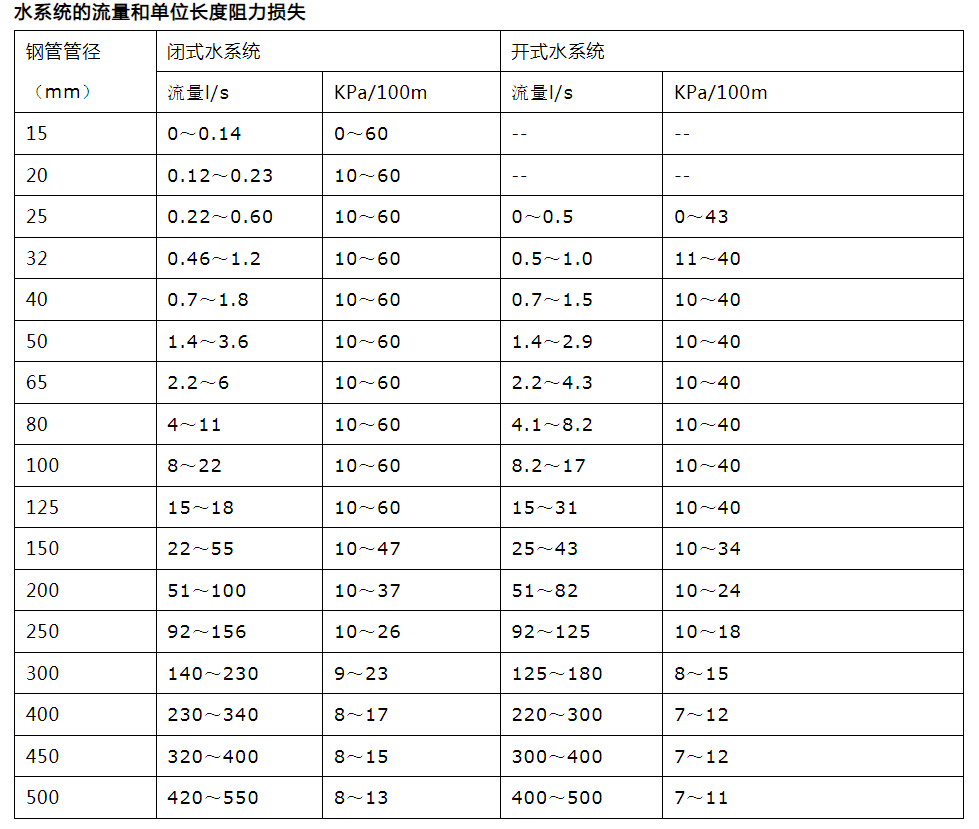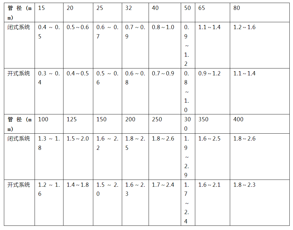 一般,當管徑在DN100到DN250之間時,流速推薦值為1.5m/s左右,當管徑小於DN100時,推薦流速應小於1.0m/s,管徑大於DN250時,流速可再加大。進行計算是應該注意管徑和推薦流速的對應。